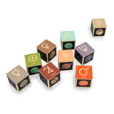 Mercury. Venus. Earth. Mars. Jupiter. Saturn. Uranus. Two debossed sides feature the planet’s symbol, name, and number of moons. The four printed sides reveal a planet illustration, diameter, location, and distance from the sun. This 9 block set honors all 8 planets in our solar system; plus a bonus dwarf planet, Pluto.
