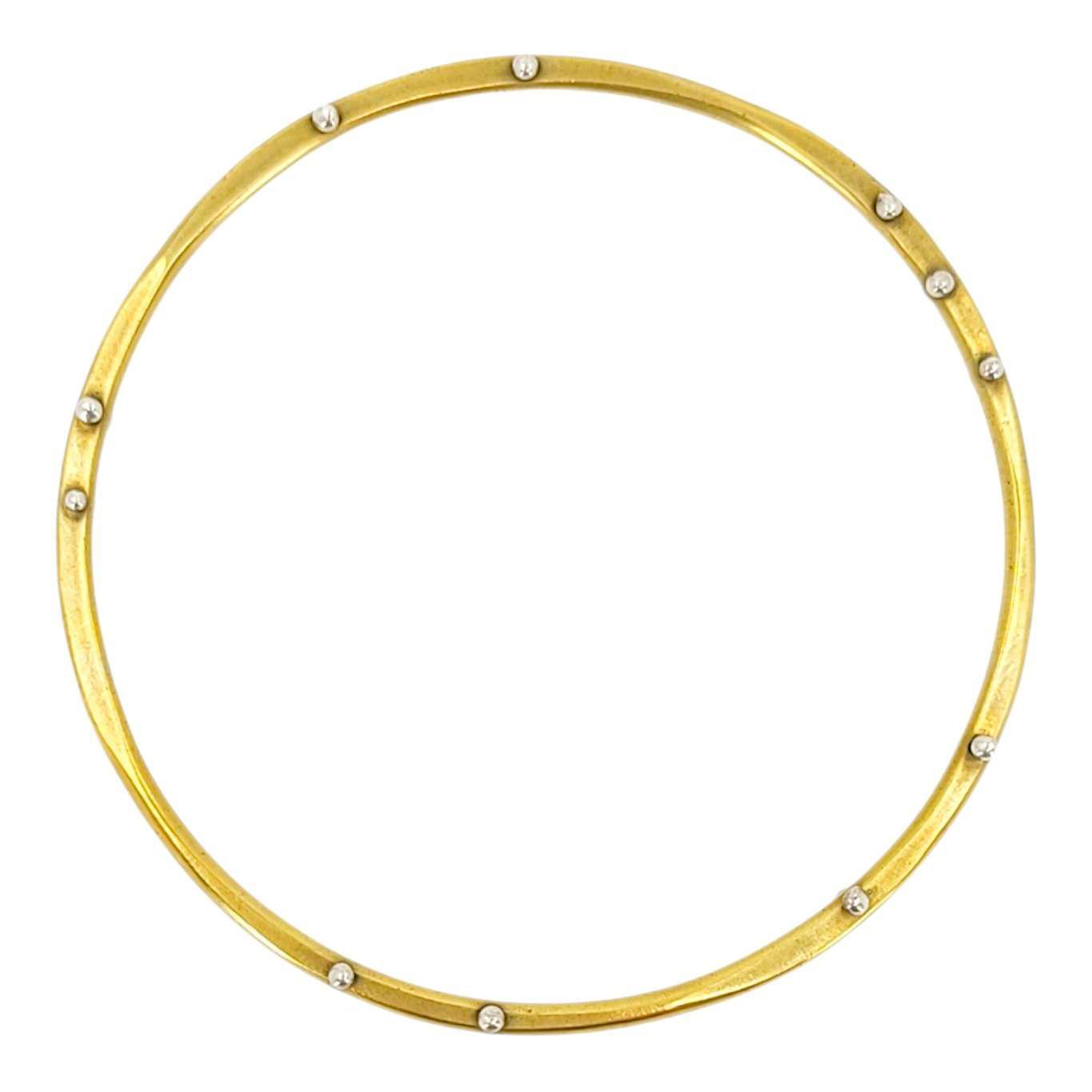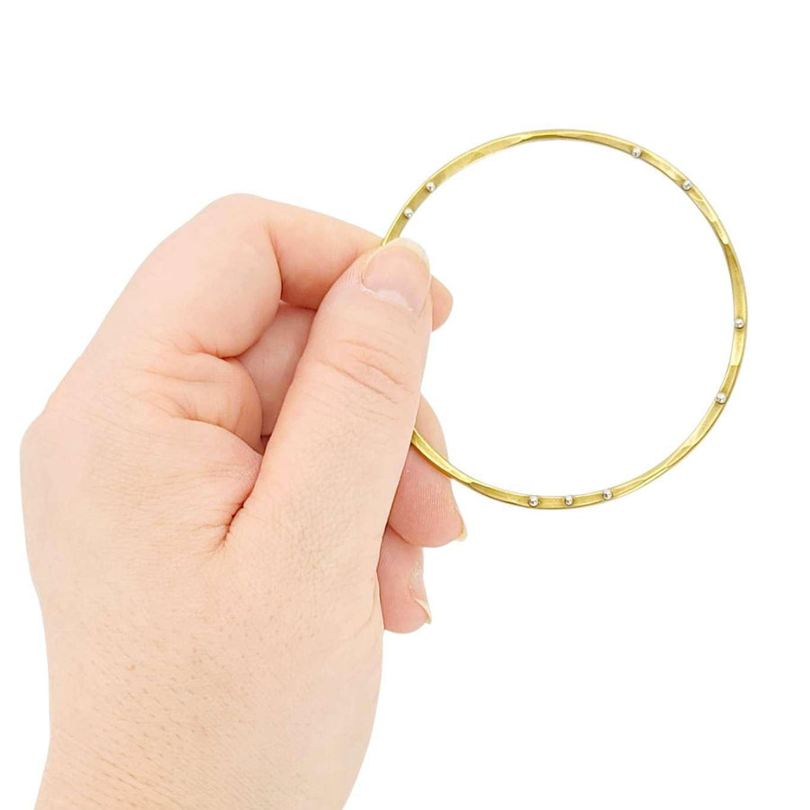 These solid brass bangles are the perfect blend of edge and elegance with a polished brass band pierced by irregularly spaced fine silver pins. The varying thicknesses and lightly faceted texture of the band elevates them even further, taking the piece from a simple bangle to something truly special.