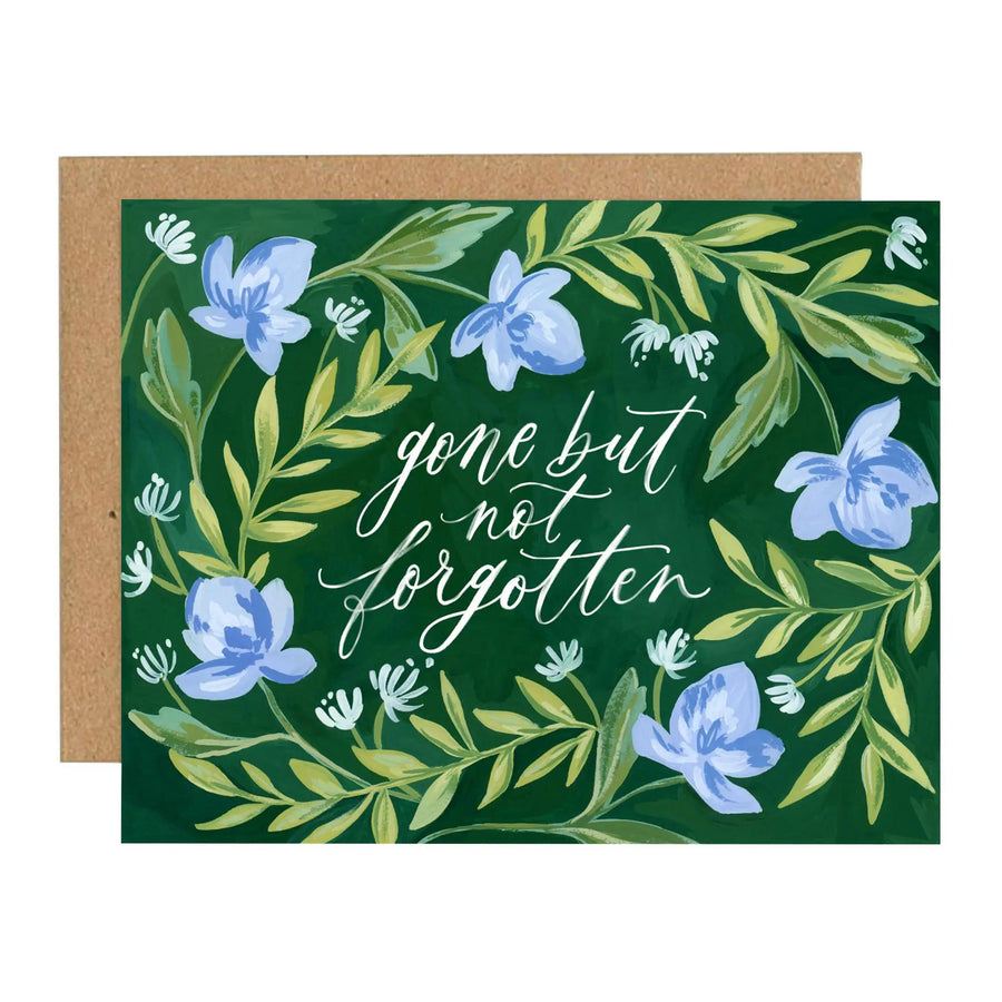 This card features the words, 'Gone but not forgotten' across the front of a painterly blue floral image.