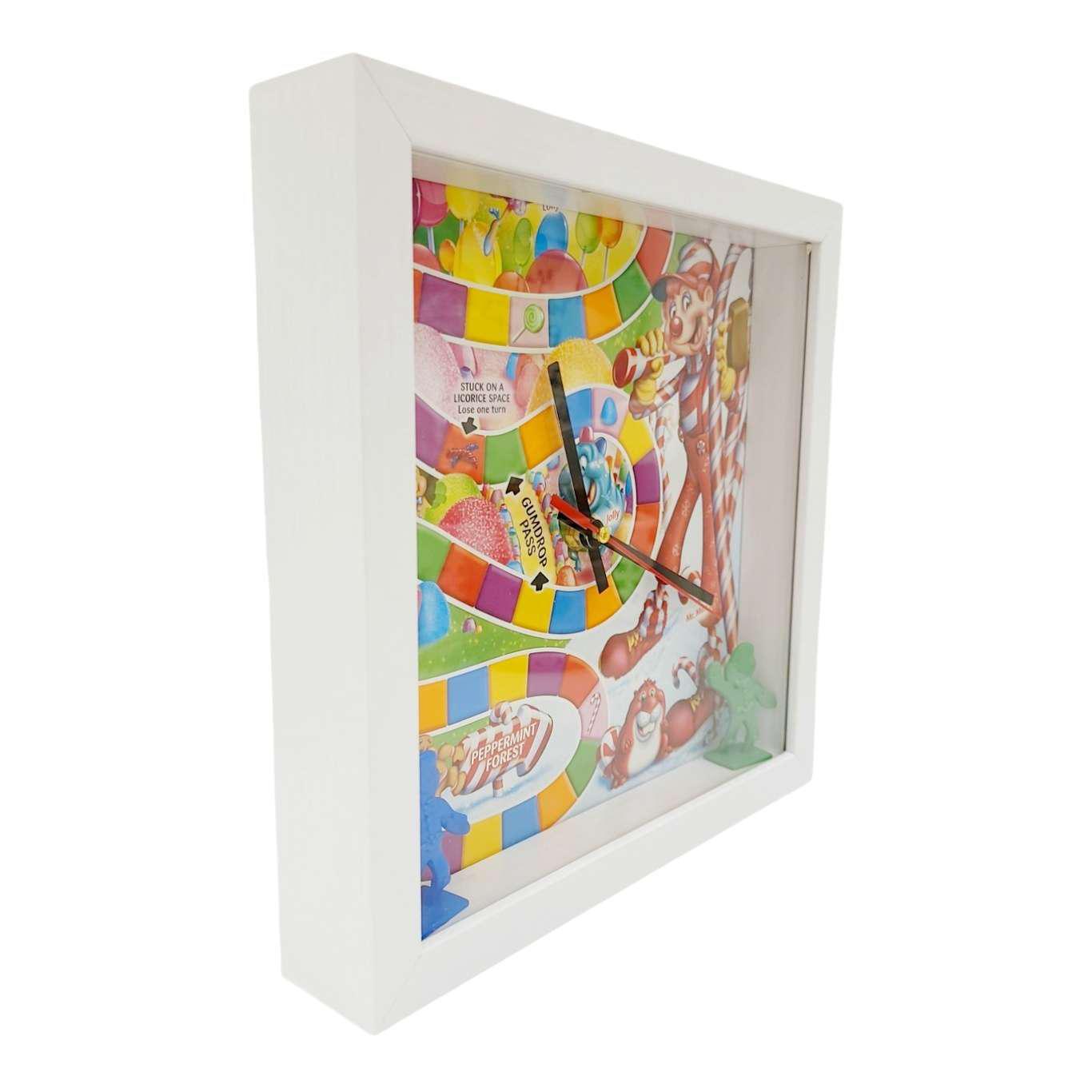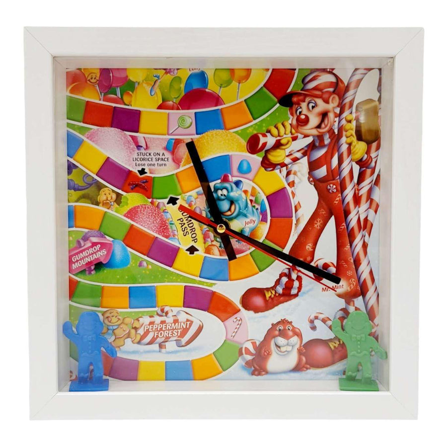 This cool clock features a section of a real vintage game board accented with real cards, dice, and game pieces from a retro game about a world made of candy!