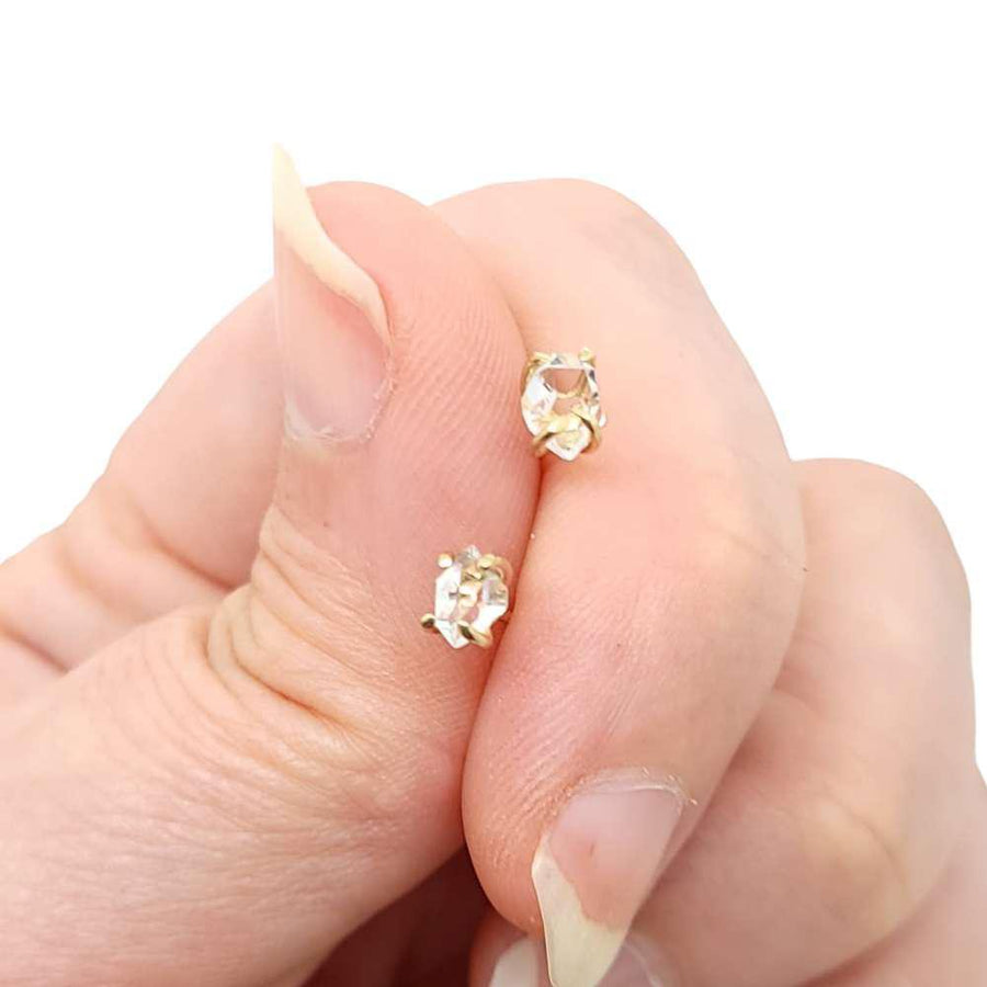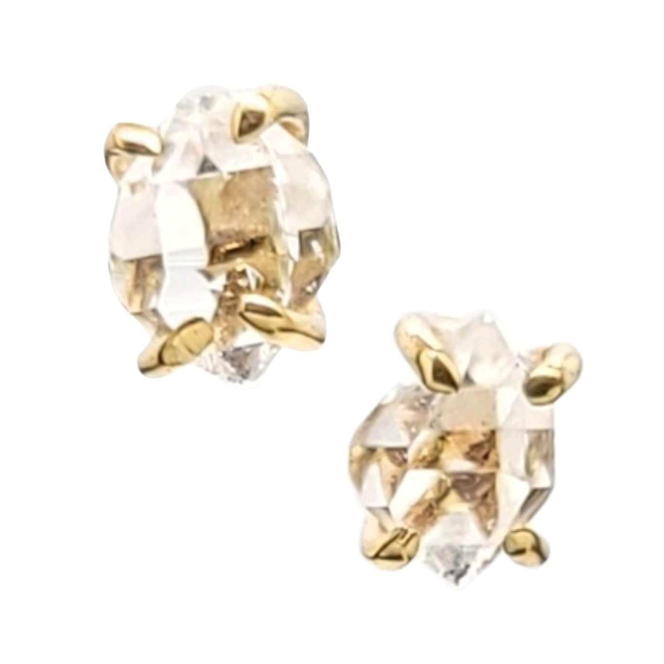 These elegant stud earrings feature stunning clear 5-6mm raw Herkimer diamonds cradled in a simple 4-prong setting of solid 14k yellow gold. The open setting highlights the raw, faceted natural beauty of the stone and really lets these earrings shine!
