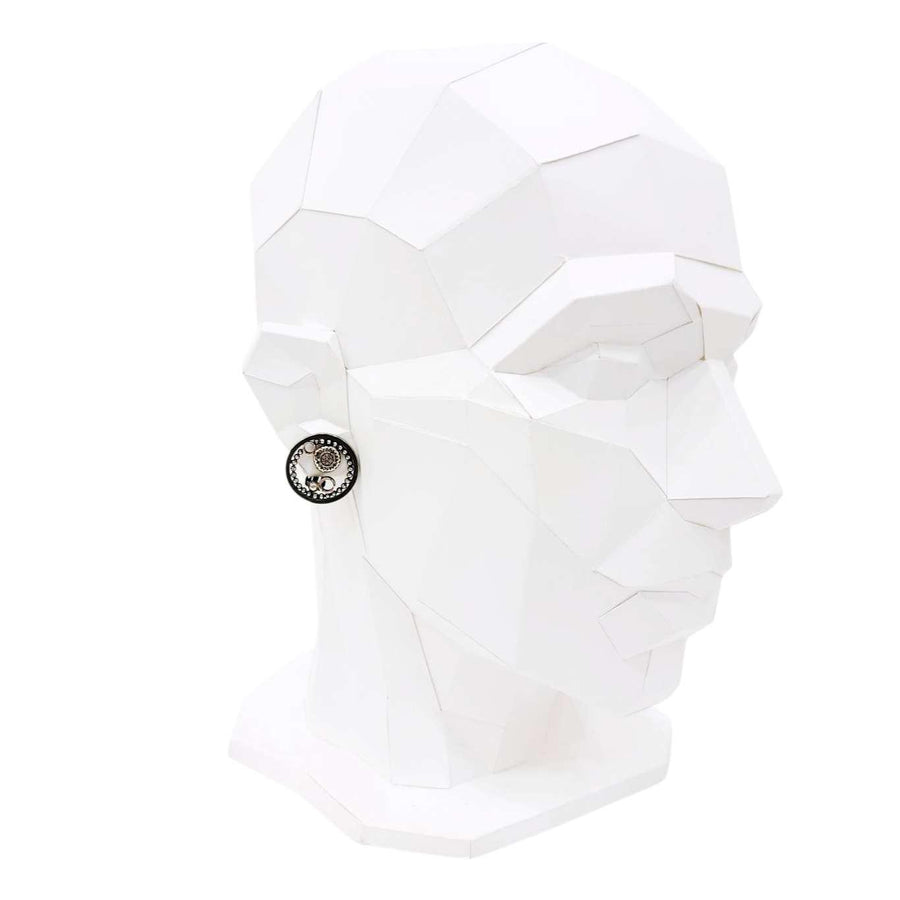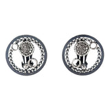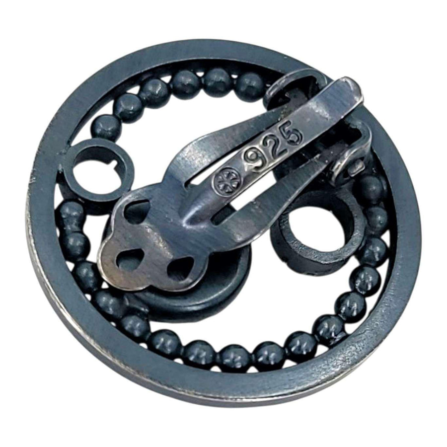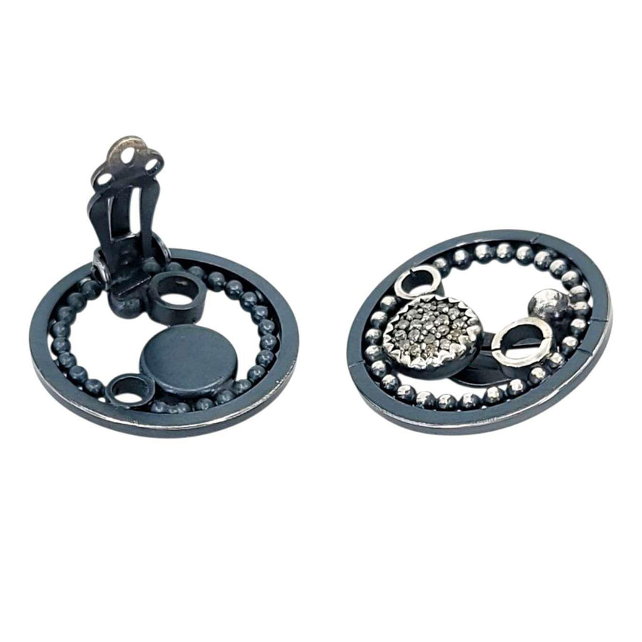 These gorgeous clip-on earrings feature a variety of sterling silver circles and beads inside a circular frame, accented with a round of pavé-set salt and pepper diamonds.