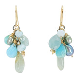 Stunning clusters of bright blue larimar, soft translucent aquamarine, and iridescent blue-gray pearls dangle elegantly from 14k gold fill ear wires.