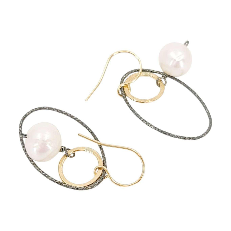 A large pearl dangles gracefully from a 14k gold fill ring on each of these elegant earrings, which are in turn framed by bold oxidized silver ovals. Each metal piece features different texture work, creating a beautiful contrast that's sure to complement any outfit.