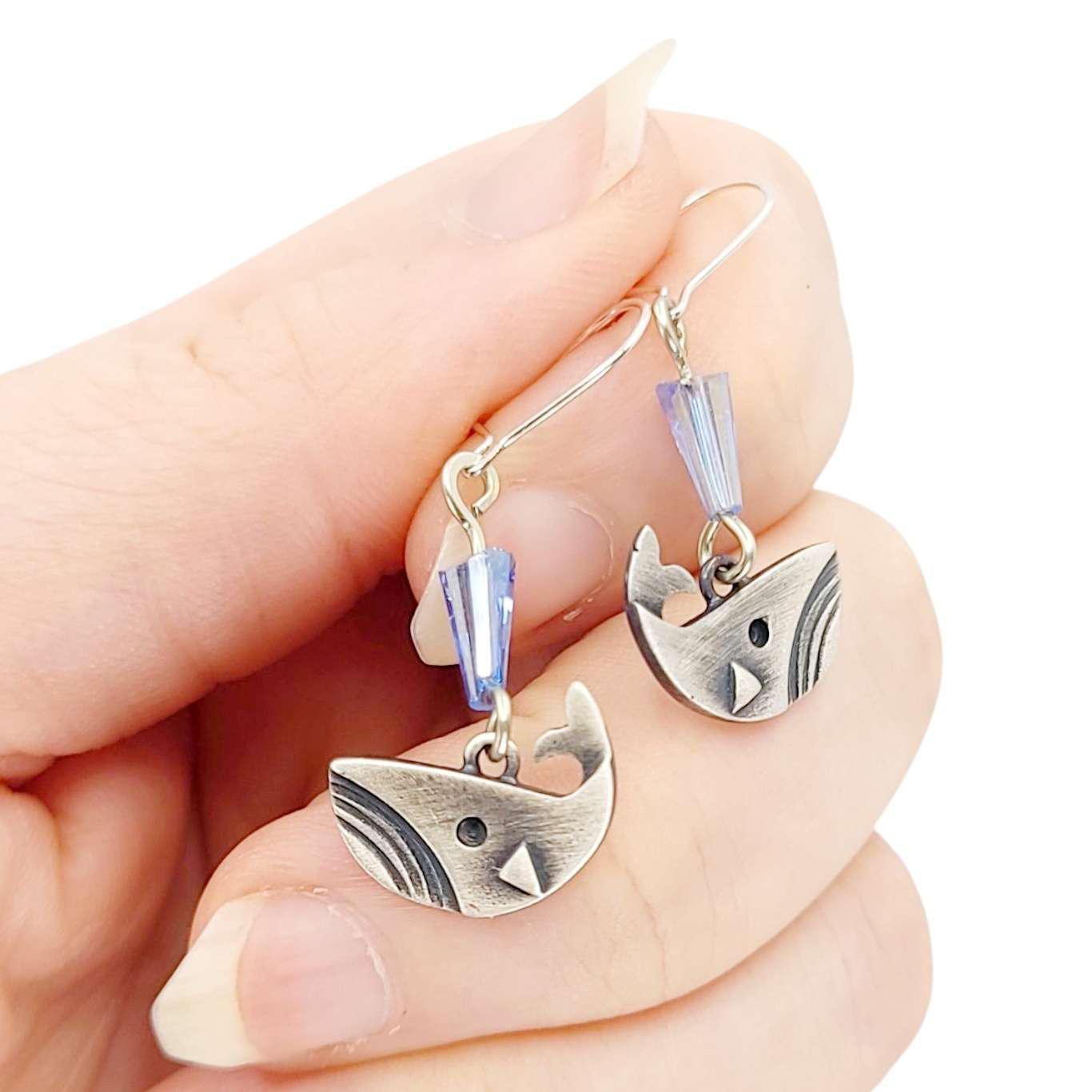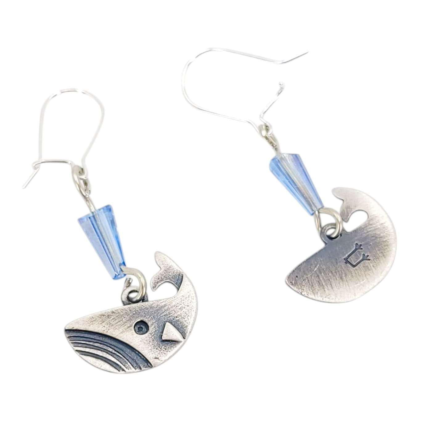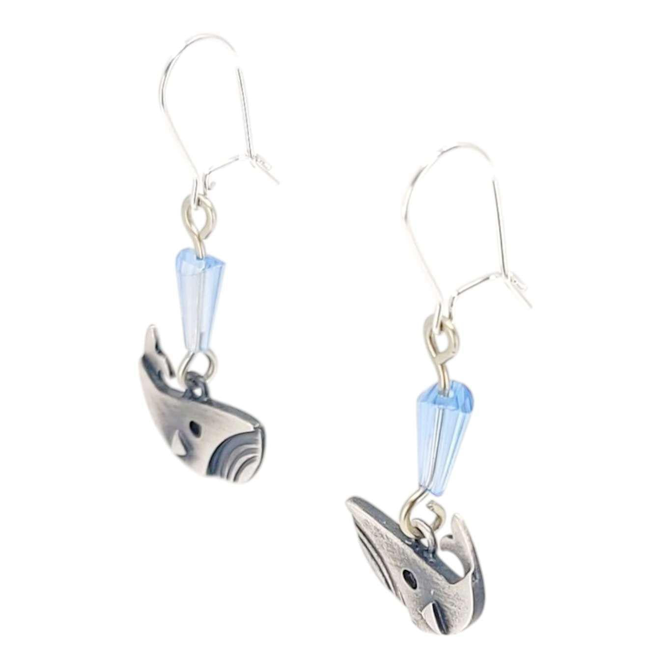 Cast sterling silver whales with a faceted fumed blue glass bead spout. Locking sterling silver ear wires.