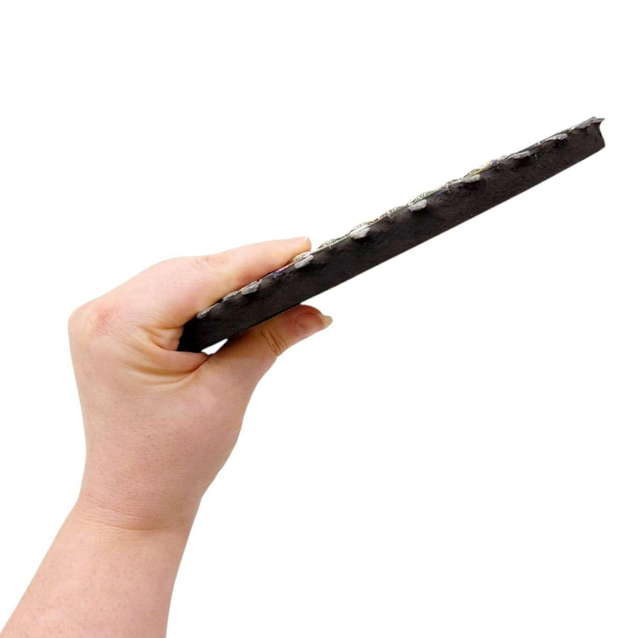 - Materials: Glass mirror, glass tiles and beads, metal beads, grout, wooden substrate, metal hardware