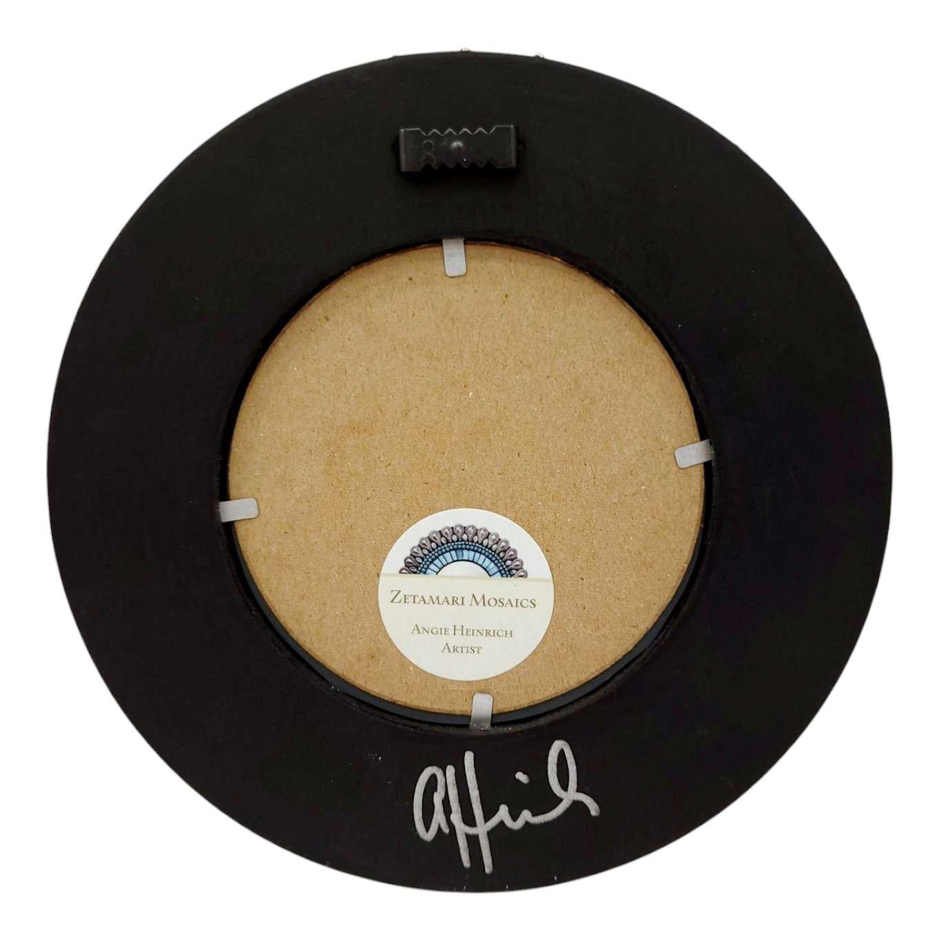 Zetamari's stunning mosaic mirror in a 7in round Aquamarine Leaf design features shimmering aquamarine glass tiles and leaves with green and blue bead accents.