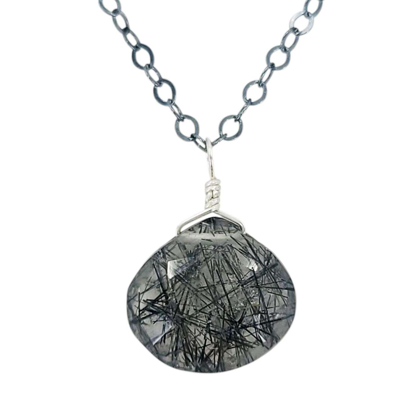 A faceted teardrop of black-needled tourmalinated quartz rests on an 18-inch oxidized sterling silver chain.