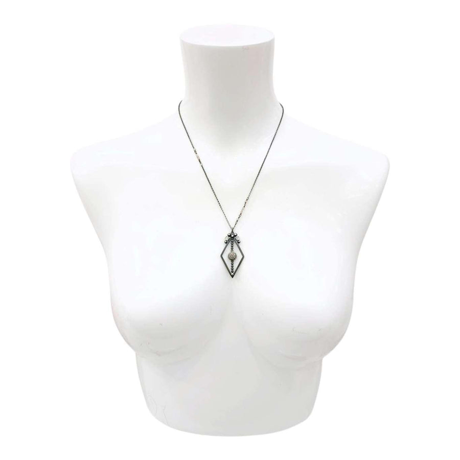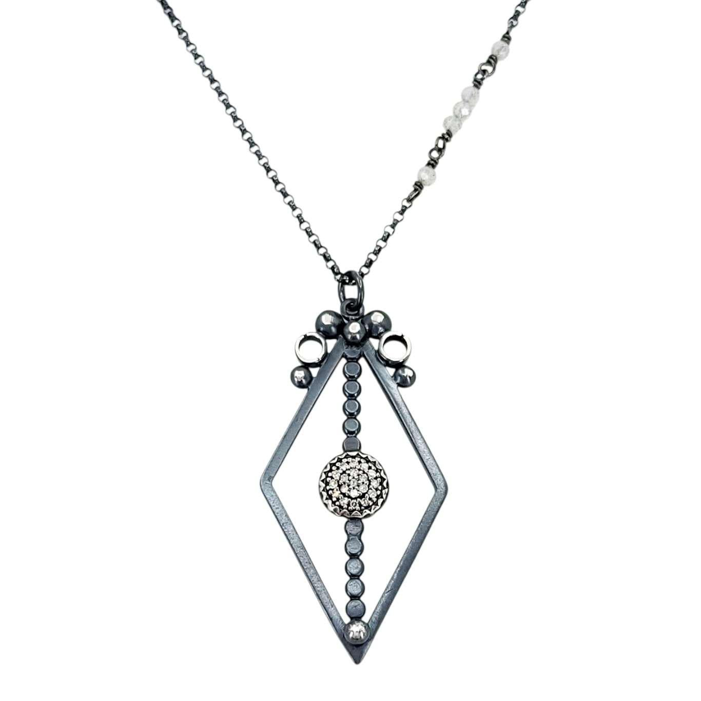 This stunning necklace features an open-frame diamond-shaped pendant in oxidized sterling with polished accents and a round of pavé-set salt and pepper diamonds.