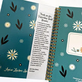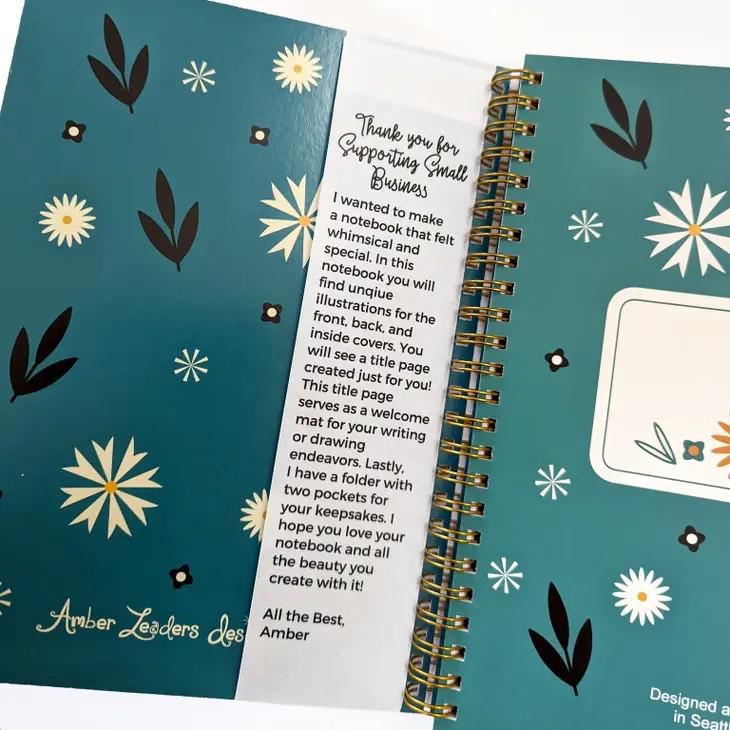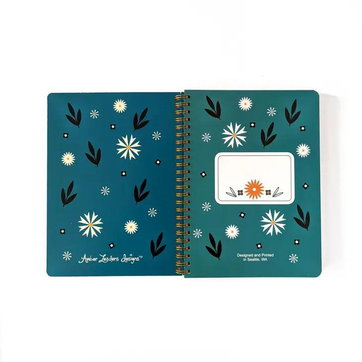 Amber Leader's now-iconic mid-century modern inspired illustration of folk-style flowers and leaves is on the cover of a spiral bound notebook with lined pages, title page, and storage pockets. Yes, pockets!