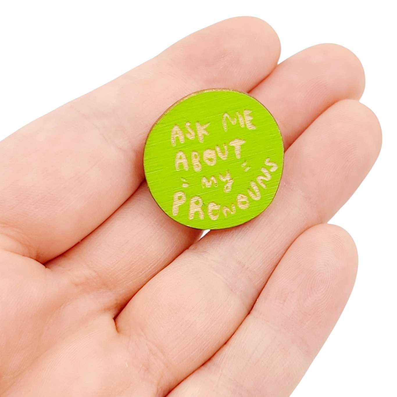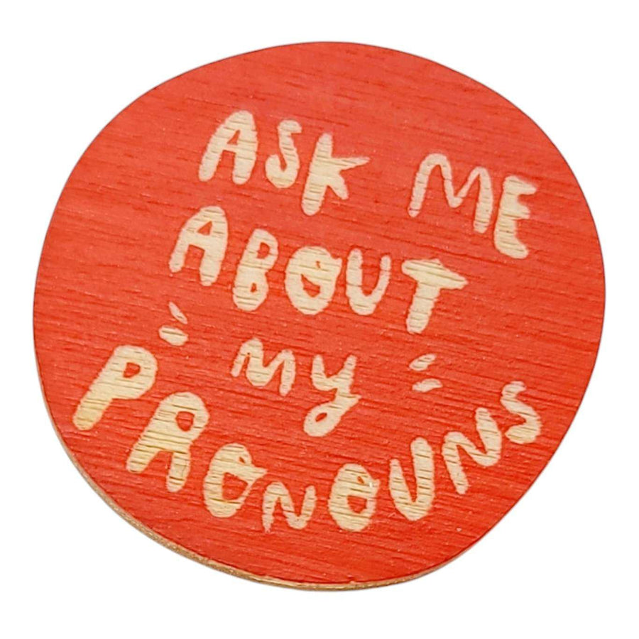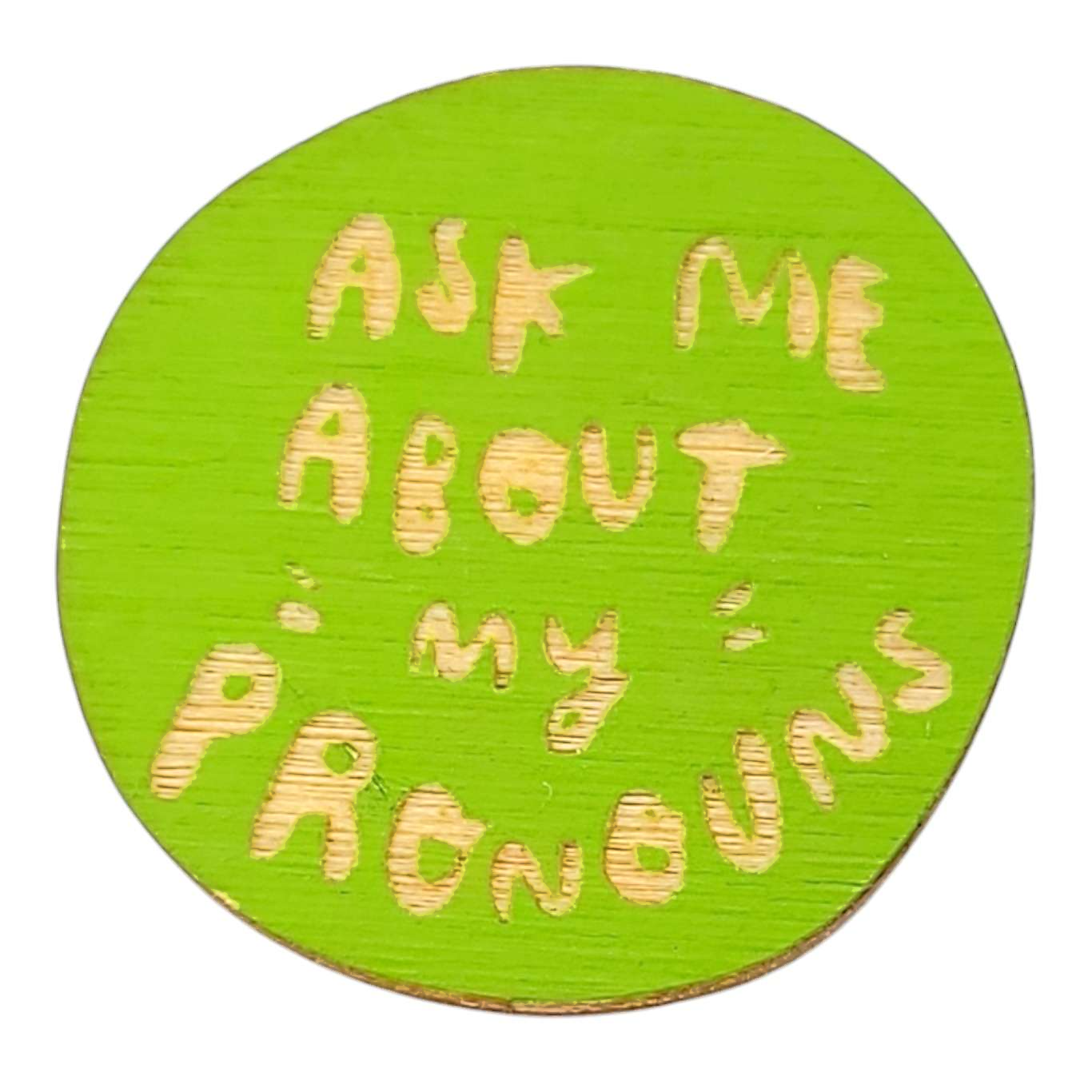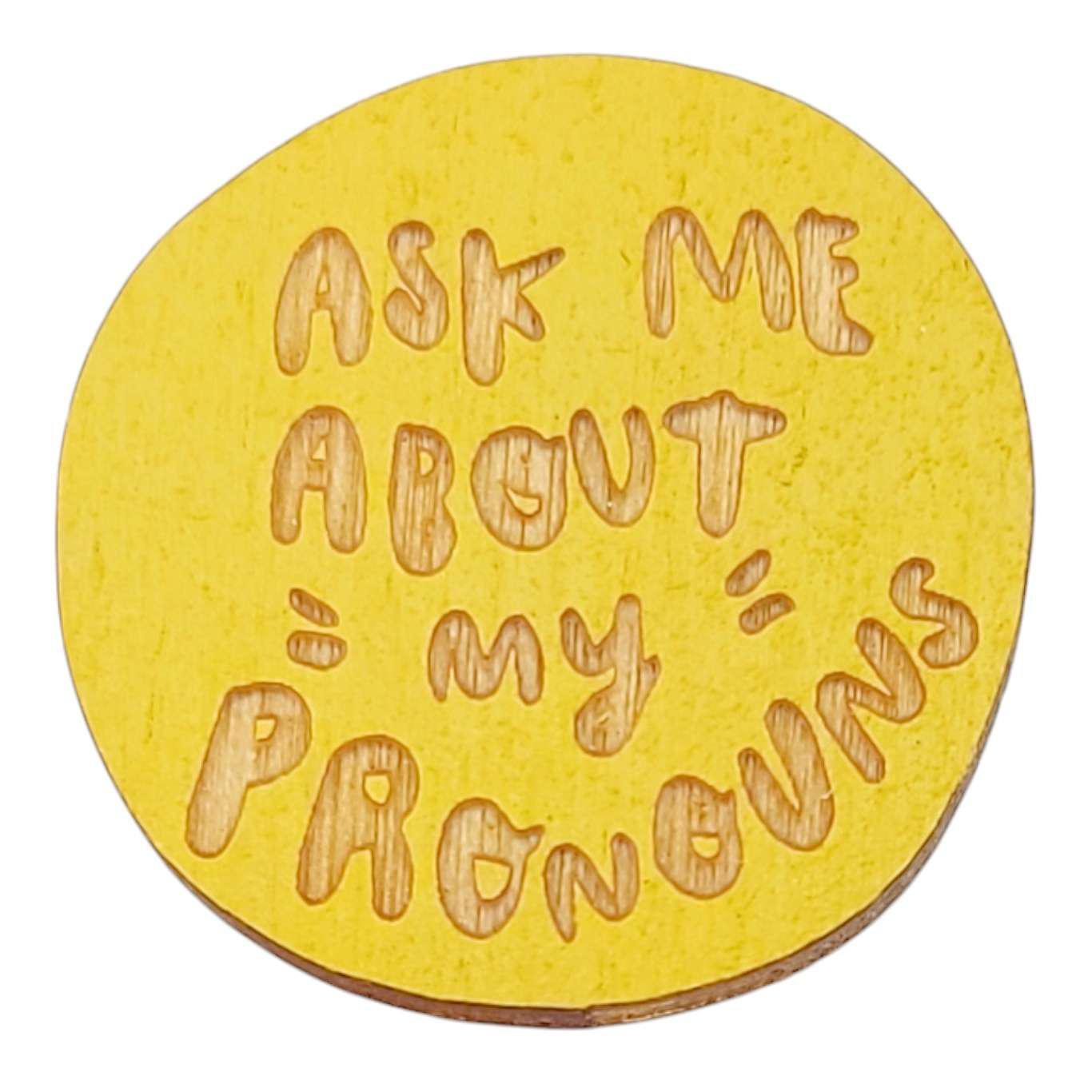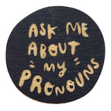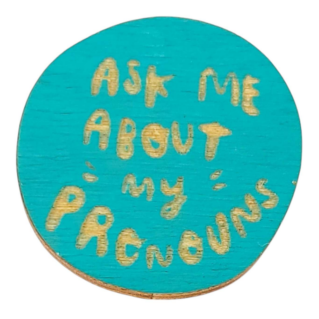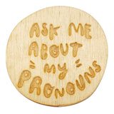 These laser-engraved hand-painted wooden pronoun pins read “ASK ME ABOUT MY PRONOUNS” in a whimsical font.
