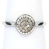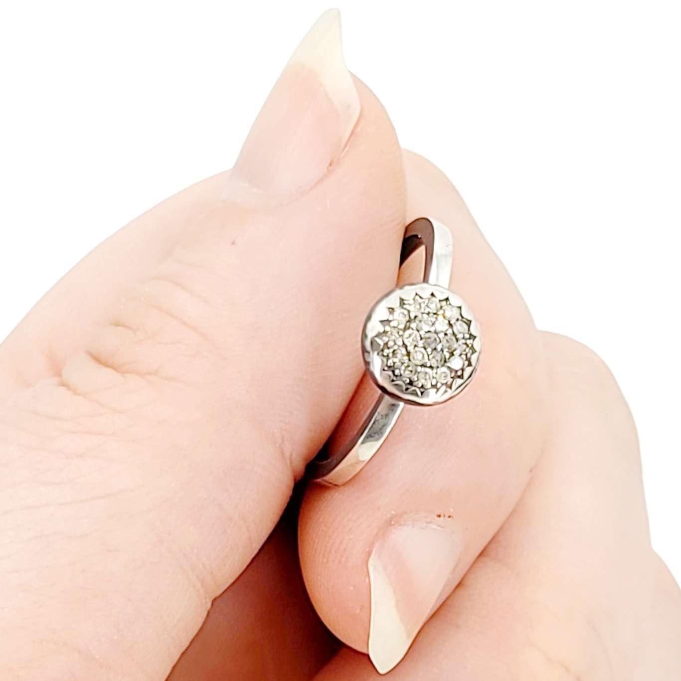 This lovely ring sparkles with 8mm of pavé diamond against a band of oxidized and polished sterling silver with accent notching.